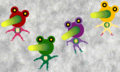 Zoh-gaero is yellow and wishes to be a soldier for the Zoh-gaeru family. They are seen rapidly jumping in place and they get annoyed if the player clicks on them enough times.