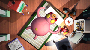 Interacting with Bu after this will cause Pon to show up. Interacting with Pon causes him to sneeze and tickle Bu's hoof. Doing it a second time will cause him to kick Bu's stomach. Doing it a third time will cause him to jump on Bu's stomach and start dancing, which finally wakes up Bu.